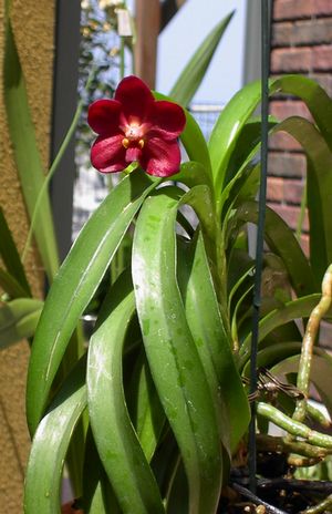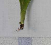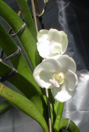 10月8日に更新したランのその後です。中心の茎が枯れ上がってぽっきりと折れてしまいました。ナントカなるはずはない と思ったけれどコップに差していると発根してきたのです左が今日のランです。右の11月5日に比べてみると、画像の大きさが小さいけれど、発根したところは同じほどの大きさに見えます。約3ミリの長さになりました。エライネ♪ がんばって生きてる!! さてあと一株大変危険なランがいます。正確な名前は聞いてないけれど バンダです。(バンダとかアスコセンダとか 洋ランの種類です。)この開花中の画像は最も美しいときのバンダさん(2003年)です一番最初に我が家に来た バンダ でした。花の終わった状態でうちに来て3年ほどたってからやっと2002年から咲き始めました。年に2,3回とってもきれいに咲くようになってたんですが、咲かせすぎたのと、水不足いろいろで去年の冬から弱ってしまいました。上の折れてしまったアスコセンダのように、下葉が枯れて、ダンゴムシに根を食べられてしまいました。 ほんらいならば一番下の四角いバスケットの周りが根っこのある場所なんですああ~かわいそうでもこのところ!! 前に比べ 少々ながら大事にお世話しているうちに 新しい根がバスケットよりずっと上から伸び始めています♪葉っぱは痩せてしまったまま、まだ開いてくれませんけれどネ・・・一番のお気に入りですから まずは葉だけ元気になってほしいと思ってます。なんとか がんばってね~~根っこの上につけているのは オアシス(スポンジのようなもの)です。 この2枚の画像が今日のバンダです。 根っこの上につけているのは オアシス(スポンジのようなもの)です。 この2枚の画像は今日のバンダです
