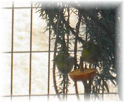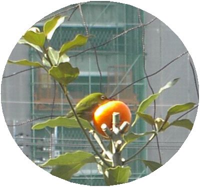 今日は青空、お日様のぞく昼下がりメジロさんが団体で来ました。空中戦を2組でしていましたから、ミカンを食べているコとあわせれば5,6羽かな「お!みかん!みっけ!」「お!みかん!食べちゃう!」「あ!見られた??!
