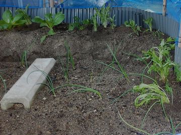 リンゴに実がついているー!!秋になって開花がまだ止まらない王林ですが、ふと上を見ると3個の実が育っています。大きいのが直径3センチです。立冬を過ぎ雨の後福岡も気温が下がってきました。どこまで大きく育つかな~ 留守中の間引き菜は じゃ~ん!! 出かける前にいただいた間引き菜を畑の隙間に植えていきましたが、水が切れて少ししおれているのもあれば元気にしているものもありました。しおれて今の葉は枯れても多分新しい葉が出てきそうですね。おいしくたっぷり育つ日 きっと来る~♪ きっとくる~♪こうやって見てみると ひどい植え方でした