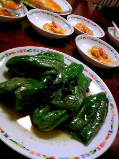 私のイチオシは【ピーマン炒め】(写真)ピーマンと黒い粒は豆鼓(トーチ)。とにかくおいしいから、これは食べなきゃです!ちなみに奥に写ってるのは【エビチリ】6人で分けると1人分はこのくらい。(そりゃそうだ)
