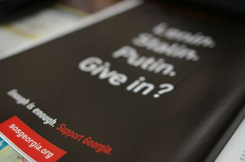 またまた、久々の日記になります。最近の報告としては、中国からお客様が来た為、大阪へ出張し打ち合わせに少しだけ同行。その後、お客様を京都市内観光に連れて行った何てこともありました。(と言っても、JTBの英語ツアーに申し込んで、一緒に回っただけなのだが……)英国人と中国人が一名ずつだったので、特にコミュニケーションに困ることもなく……。英語と中国語で何とかなった……ような気がします。ついでだから、もう一つ報告。二週間ほど前から英会話のBerlitzに通い始めました。実は、6月頃に英検一級を受けましたが、見事に二次試験で落ちまして……。一次は通っているので、再受験制度でさっさと二次を通りたいと、英会話に通い出した次第です。金が……半端なくかかってますが……。そして、いよいよ本日の本題。先々週は大阪出張で時間がなかった為、その週のThe Economistをほとんど読んでない。そういう時に限って、Special Reportが組まれる……。仕方がないので、先ほどから少しずつ読んでいたのですが……。非常に印象的な広告を見付けてしまいました。全面広告自体は珍しくないのだが、こんなにimpressiveな広告は珍しい。黒字に白文字で「Lenin. Stalin. Putin. Give in?」……たったの四行。sosgeorgia.orgのホームページアドレスで一目瞭然。思わずアクセスしてしまいました。(自己責任でどうぞ)ホームページを見る限り、どうやらGeorgiaに滞在している有志が友人と共に作っているらしい。ホットな話題だけに、思わず日記に書こうと思い立ちました。英語なのでなかなか読む気もしないが、雰囲気を味わうだけでも良いかと思います。