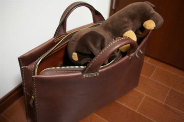 タイトル通り、バッグ買っちゃいました。平日では唯一授業がない水曜の仕事帰り、前々から気になっていた渋谷の店で買ってきました。職人が手で作っているホンモノのバッグ。値段は結構するものの、ブランド物に比べれば遙かに安い。ブランド物は嫌いなんですよね。需要と供給のバランスが全く合っていないし、ネームバリューを除くと値段相応でもない。そもそも最近は、安い労働力のある国で作られているからボロ儲けしているはず。気に入らない。このバッグはと言うと、コンセプトが一生物というだけあって、作りが頑丈。革は分厚くて堅いし、糸は一番太い物を使っているそうで……。その上、ファスナーと底鋲と縫い糸を除けば全て革。書いているだけじゃ分からないので、写真でも載せておきます。何か汚いモノが潜り込もうとしている……。犬!新品のバッグに土足で入るな!こうなったら……中に閉じこめてやる。イニシャル入りのネームタグまで付けてもらいました。って……犬~!何でそんなスッキリした顔してるんだよ!まさか、お前、中で用を足したのか?お前の皮でバッグ作っちゃうぞ!まぁ、兎に角、このバッグを愛用していきます。ついでに、このバッグを作っているのはHerzというところ。ビジネスバッグが主力ですが、女性向けバッグや小物、カメラ用バッグなんかもあったりします。良いモノを長く使いたい人にはお勧め。(ついでに僕のバッグはB104-M)P.S.1 チョコもらっちゃいました。 嬉しいなぁ~。 と言ってもあれは会社の部内での義理チョコ、みんな同じ物をもらってました。 まだ食べずに置いてあるので、未だにワンワンが涎流してる……。 P.S.2 以前から気になっていた同期が転勤。 金曜に同期で集まって飲みに行きました。 もう二度と会うことはないような気がする……。
