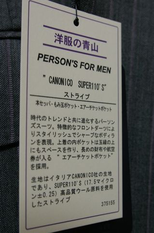 とりあえずラベルを……。実は今まで良いスーツを持っていなかったわけでして……。大体がデパートで安売りされているスーツ。2着で15,000円とか……。しかも父親が半強制的に買うのでサイズもバラバラ。僕は細身でYA7サイズでもぶかぶかなのに、安売りされているA7サイズを父親が買ってくる。(もちろん支払いも父親担当なので文句は言えないが……)そんなこんなで、暫く前からスーツがくたびれてきている。いざクリーニングと思ったのだが、スーツは高い……。一着数千円の安物スーツにまた数千円かけて洗うのもどうかと……。という事で未だにクリーニングはせず、シワシワのままで頑張ってます。ちょうど今がシーズンの終わりという事もあり、新しいスーツを買おうと思ったわけです。(実は2週間前に買ってたりするのですが……その話はまた後日)ここ数週間、色々と見て回ってましたが、遂に昨日青山でピンと来てしまった。グレー系のスーツは1着あるのだが、生地が紙のような触感でやたらに薄い。もちろんストライプなんて入ってない。(むしろ今持っているスーツでストライプが入ってるのは一着もない……)裏地がやたらに派手なんですが……ちょっとだけ脱線……。色は紫と青に見えているかと思いますが、実は両方とも紫だったりします。青い方、もっと赤みが入っていて暗めの紫色なんですよね。(いや、話には聞いていましたが、デジカメって本当に紫色は撮れないんですね)そしてラベルにもあったとおり、キャノニコの生地を使ってます。(裁縫はお決まりのMade in Chinaですが……)裏地は全てキュプラで安っぽさも出てませんし、ちゃっかり本台場仕立てです。何気に嬉しい袖ボタン……。椰子の実か何かから作ったボタンで、もちろん本切羽。(出来れば重ねボタンが良かったのだが……まぁしょうがない)今までデパートで買っていた僕から見れば「超高級」のスーツ。でも、値段が意外と安かった……。キャノニコなんて6,7万はするはずだが、5万前後の国産スーツの中に一着だけ紛れ込んでいた。(触った時にコイツだけ明らかに触感が違うし……)しかも、5万は元の売価。今は2着目1,000円で買えるキャンペーンが云々。セールされているキャノニコはこれだけだったし、そんなにいらないし……。ごちゃごちゃ交渉したら、これ1着のみを半額にしてくれました。って事で、26,000円で買えたわけですが……いや、それでも高いかも。キャノニコって触感が良いが、生地の繊維が薄いとか何とかで……。要は摩擦に弱く、皺にも弱く、デリケート。今までスーツ着て自転車乗ってましたがもう無理ですね。着るのは週に1,2回にして着た後はブラッシングして……。雨が降りそうな日はタンスでお休みしてもらうよう手配いたします。あ、スーツネタですが、来週辺りもう一度あるかもしれません……。