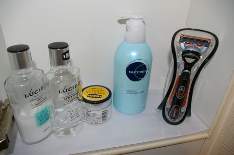 あけましておめでとうございます。大分長い間書いていなかったようですが、久々に日記でも書いてみます。タイトルにもある通り、生まれて初めて本格的にカミソリでひげを剃ってみました。(最近、愛用していた安物シェーバーの調子が悪く、スイッチ入れても動いたり動かなかったり……)何を始めるにもまず初期投資。ホームセンターでカミソリとシェービングクリームを買ってきました。折角だしそんなに高くもないので手を出したのはジレットの5枚刃、しかも電動タイプ。(5枚刃とか言っておきながら、実は細かい所を剃る為に1枚別にあり、実質6枚)シェービングクリームと合わせると大体二千円位。まぁ、そんなもんでしょう。ってことで、先ほど風呂場で剃ってきました。シェービングクリームを使うのも始めてで、口の周りが泡だらけになって違和感が……。しかも、カミソリのスイッチを入れてみると、ブルブルと振動しだしてくすぐったい……。で、実際に剃ってみると……剃れているのかどうか分からない。(流石に顔を切ったんじゃシャレにならないので力は全く込めず、滑らすだけ……)とりあえず剃りやすい頬は楽に剃れたが、口の周りや顎の下はあまり剃れた気がしない。僕はそんなに髭が濃い方でもない。剃れなかったら明日の朝、シェーバーに最後の力を発揮して貰えばいい。クリームを落としてさっさと風呂を上がりました。全く力も入れてないし別に顔を切った覚えもないのに、顔中ヒリヒリする。シェービングクリームのせいかとも思ったが、どうやらそうでもないらしく……。いつも使っているアフターシェーブローションを付けると、しみるのなんのって……。どうやらカミソリに負けてしまったようで……。しかもよくよく見てみると、口の周りと顎の下は全く剃れてない。と言うよりもむしろ、全く剃ってない。次回はもっと意識的にこの部分を剃らないと……。ただ、頬の方はツルツルに剃れていて、安物シェーバー(約三千円)の剃り味とは比べものにならなかった。とりあえず明日の朝、剃れていない部分をシェーバーで剃る。朝っぱらから流血事件を起こしたくないので、暫くカミソリは風呂場の中だけにするつもりである。一応写真も撮ったので載せておきます。左の三つは今まで使っていた化粧品。水色のボトルがシェービングクリーム。右のヤツが5+1枚刃のカミソリ。よくよく考えれば明日から学校だったりする。一応準備は出来ているのだが……。行きたくないなぁ~。学校じゃなくて会社でした……。