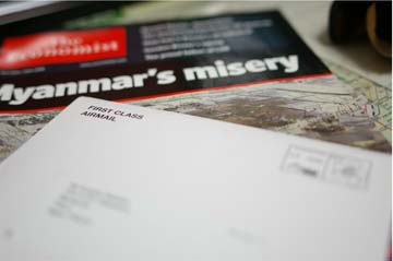 ガーン……。投稿したつもりの日記が何故か下書き状態だった……。ってことで、以下、5月12日に書いた(記憶がある)日記です。数ヶ月ぶりに日記なんて書いてみます。ここ数ヶ月、大した出来事もなく平々凡々に過ごしています。さて、時間がないのでいきなり本題。以前は電車の中で英字新聞なんて読んでいましたが……高い。その癖、高い割にすぐ廃れてしまい、一週間も経てば大部分が紙の価値しかない。色々と考えた結果、雑誌を取り始めました。ただ、アメリカ嫌いになってしまったせいで以前のTIMEに戻れるわけもなく……。Newsweekもダメなので、消去法で行き着いた先がThe Economist。知る人ぞ知るイギリスの英文雑誌。2,3回試し読みしましたが、Timeと違い、写真で誌面を誤魔化していない。写真ではなく文章で情報を伝えている所に良い印象を持った。難しいと一般に思われているようだが、難しいのは単語と一部の専門知識だけ。文法自体はしっかりした筋が通っていて、良い辞書とちょっとした興味さえあれば結構読める。(もちろん、日本語で読んでも分からないような内容の物もあり、こればかりはどうしようもない)という事で、一年間の定期購読をしてみました。購読料は以前のTIMEと比べると2倍以上で、3万円を超える……。(でも、よくよく考えてみると毎日160円の英字新聞を買うよりも安いのだ)四月中旬から読み始めたが、今日家に帰るとこんな手紙が届いていた。FIRST CLASS AIRMAILとあったのでてっきり航空会社からかと思ったが、The Economistらしい。封筒にTwo simple wordsとあるからまさかと思いきや、案の定Thank youだった。臭いなぁなんて思っていたら、中身は結構洒落ていて、ちゃんと僕の名前までしっかり印刷されている。しかも真っ赤なカードまで付いていて、これまた丁寧さが感じられた。(カードのデザインは最悪だが……)実はインターネット上から、毎週の雑誌に収録されている全ての記事を朗読した音声をmp3ファイルでダウンロードできる。(購読者ではなくてもOK)まとめて一週間分ダウンロードしてiPodに入れ、電車の中で聴きながら記事を眺めている。綺麗なイギリス発音で読まれる朗読比較的速く、さっさとおかげで眠くなることもなく、読むスピードもちょっとだけ速くなる。実を言うと復習が追いついていないのが難点なのだが、いずれは読んだ側から理解できるようになりたいと思っている。全く関係ないが、最近はほとんど写真を撮っていない。上の写真は久々に自慢の28mmF1.8のレンズで撮ったもの。1,3,4枚目は絞り開放(F1.8)で撮っている。拡大すると収差とかと呼ばれている色の滲みようなものが見られるが、それでもこのボケ味は特筆に値する。もうすぐレンズにとって大敵となる梅雨の時期がやってくる。カビが生えぬよう、たまには使わないとなぁと思いながら今日の日記を終えます。