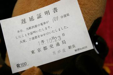 今朝面白いことがあったので日記でも書きますか。実は毎朝都営地下鉄大江戸線で通勤してるんですよ。で、ニュースでも取り上げられているように、今朝この大江戸線が止まりました。バッチリ巻き込まれてしまいましたよ。僕は始点の光が丘から乗っていて、今日はいつもより10分ほど遅れて駅に着きました。ホームに入った時、ちょうど目の前を地下鉄が通り過ぎた為数分待つ羽目に。数分後、いつものように地下鉄が来て、いつものように席に腰を下ろしました。しかし発車時間になっても発車せず、代わりにアナウンスが……。「この先で停電が発生し、発車を見合わせております」とのこと。停電で交通機関が止まるなんて聞いたこともなかったが、まぁ待つしかない。5分ほど待っていたら復旧したそうで、地下鉄は発車しました。次の駅は練馬春日町、何事もなく通過。その次の豊島園も無事通過。練馬駅に向かう途中で突然、車内の電気が全て止まりましたが、地下鉄は無事練馬駅に滑り込みました。(驚いた事に、車内が真っ暗になっても誰も動揺していなかった、さすが都会人)練馬駅のホームは明るいのに地下鉄内は真っ暗、流石にホームで待っていた人は目を瞠っていました。そんなときに車内放送。「再度停電が起き復旧のメドすら立たない、振り替え輸送しているから急いでいる人はどうぞ」云々。僕は大江戸線一本で会社の最寄り駅まで行けるので乗っていたかったのですが、やむなく他線に乗り換えることに。幸運にも地下鉄は練馬駅で止まったので、西武池袋線に乗り換えることにしました。混むだろうなぁとは思いましたが、改札どころかホームの階段にすら登れない。どうやら改札で駅員が一枚一枚ご丁寧に振替証やら何やらを配っていたらしく、そのせいで長蛇の列。暫くしてようやく現実に目覚めたらしく、振替証無しでも行けると叫び始めました。さっさと改札を突破し、さっさと西武線のホームへ。(もちろん、切符なんて買ってません)そこで池袋行きの西武線に乗ったのだが、これがあり得ないほどの満員電車。ウゲェ~って位に押しつぶされようやく池袋に到着。咎められずに改札を通り、今度も切符を買わずにJRの改札を通り抜けました。(連絡はしっかり行き届いていたようで、大江戸線の定期を見せるとどの鉄道会社もすんなりと通してくれました)そのまま山手線でグルッと半周し、ようやく会社の最寄り駅に着いた時は既に九時半すぎ。遅刻です。もちろん無断で遅刻してません。練馬駅で地下鉄を降りた時に会社へ電話して事情を説明しました。西武線とJR線の遅延証を貰い、夕方帰る時に大江戸線の遅延証も貰ってきました。まぁ、影響はほぼ無かったと思いますが、僕はどうやら運が良かったみたいです。ニュースを見ると新江古田駅前のトンネルで止まった便もあるらしく、二時間閉じこめられた乗客もいるのだとか……。(数年前に韓国で大規模な地下鉄火災があり、乗客が閉じこめられて大勢亡くなったが、どうやらその教訓が生かされていないらしい)時間から見ると、この便は僕の前の便の可能性が高い。もしも今朝、いつも通りかいつもより早く家を出ていたらトンネル内を200m歩く羽目になったかもしれない。(まぁ、そしたら、写真の一枚でも載せられたのだが……)折角だから大江戸線のビックリ遅延証を載せてみますか。180分って……あり得ないだろ。この遅延で何億、何十億、何百億の特別損失が計上されるのか結構気になる。(例えば、この遅延のせいで飛行機に乗り遅れた場合保証してもらえるのだろうか)でも、電車の遅延は日常茶飯事だから意外と損失は出ないのかも。どちらにしろ、停電は変電所が何かを見落としたミスらしいので都営地下鉄はあまり損をしないのかもしれない。
