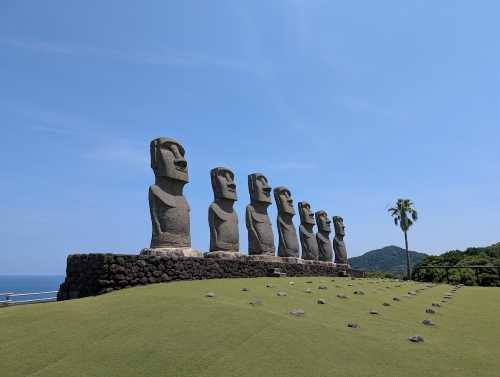 さて、ここはどこでしょう?宮崎・日南市にあるサンメッセ日南。広大な丘陵なのでカートを借りて回ってみた。ガタゴト来たけど結構上まで来てる。歩きではこの暑さの中絶対無理だったと思う。カートさまさま。ここは太陽の丘だって。真っ青な海、ヤシの木、とても国内とは思えない。誰じゃ? あなたは・・・。ガタゴト、ガタゴト、振り落とされないようにしっかり掴って。。。イースターのモアイ修復チームに3年加わって15体起こした実績のお礼に7体の復元がここに許されたそう。札幌の藤野にあるのもそういう謂れなんだろうか・・・。無許可ってことはないよね。。。これ、日本よ?太陽の丘には蝶の模様も。気温さえ普通なら開放感もあり、スタッフはとても優しく、南国気分になれてとても素敵なところだと思う。こんなとこあったんだ!って感じ。35度超えの夏に行くのは苦行だったかも。暑さに耐えかねて食べたマンゴーソフト。一瞬、暑さから解放された。