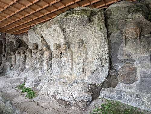 大分県臼杵にある磨崖仏(崖や自然の石に彫る仏像)。駐車場からてくてくと丘を登り・・・・。ホキ石仏第二群。↑ホキというのは崖のこと。小さめの九品の弥陀たち。阿弥陀三尊像。平安時代から鎌倉にかけて彫られたらしい。またまた丘をてくてくと上り、ホキ石仏第一群。如来三尊像。へえ、いっぱい彫ったなぁ。仏様のとは全然わからないけど、平安、鎌倉となるとすごいのわかる。大分の土地で平安時代にいったいぜんたい誰がこんな大事業を始めたんだろう。大宰府あたりの立地ならわからなくないけど大分って誰がいたんだ・・・。なかなか頑張って上った。ものすごく暑くてジリジリと日傘をさしてても陽ざしを感じる。もっと寂寞とした感じなのかと思ったら立派な施設で驚いた。仏様に詳しくない私でもほほぅと思った。意外と?外国人の親子連れが何組かいて不思議な感じ。↑騒がない方の外国人。詳しくお知りになりたい方はこちらで。