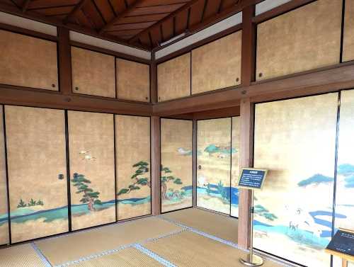 仙巌園御殿見学のラスト。化粧の間。当主が着替えたり身支度した部屋。明治に狩野派の絵師によって書かれた物を2018年に復元。元々は金箔が貼ってあったのを実物を高性能カメラで撮影し風合いの似た紙に印刷したんだって。殿様が入られるお風呂としては小さいな。っていうか、このサイズに収まれるって小柄ってことか。当時は別の場所からお湯を運んでたらしい。暑さゆえか金魚が一匹死んでるようだっのですぐさまスタッフに報告。ものすごく驚いて「ありがとうございます」と飛んで行かれた。披露の間。贈り物を受け取った時に披露する部屋なんだとか。どんな宝物が披露されてたのか気になる。