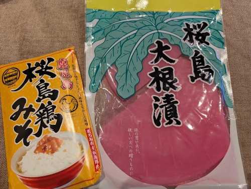 火の島めぐみ館で買った物。この桜島鶏みそってすごくお勧め。お豆腐にのせても美味しかったし、ピーマンや茄子を炒めるのに使ってもとっても美味しかった♪ネットで探したけど同じ物は見つけられなかった・・・・。あまりに有名な桜島大根のお漬物。これがすでにカットしてあるのに信じられないほど大きくてびっくり。まな板がほぼ隠れるくらいの大きさ。どう切ったらキレイに見えるのかしばし考えてしまった。元々の桜島大根ってどれだけ大きいのか・・・・。鹿児島市内ではほとんど買い物する時間がなかったからここでお茶もいっきに買う。旅先で毎日飲むものを買い付けるって「今日から彼杵」「今日から知覧」と発表したりして楽しい♪