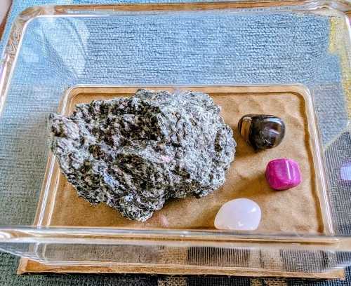 阿蘇山の中岳火口でhusが見つけた「阿蘇の光る石」、流紋岩。何度も取り直ししたけどもっと金箔を細かくしたような薄ピンクのキラキラがいっぱいついてる。大きいのはhusが選んだの、右の小さいの3つは私が選んだ名前もわからない石。ちょうどケースがあったのでこうして入れて玄関のコーナーに置いてある。説明書に「置き場所・玄関」と書いてあったから。なんか魔除けとかパワーとか?いやいや、その説明より小さな石がそれぞれ何なのか書いてほしかった。