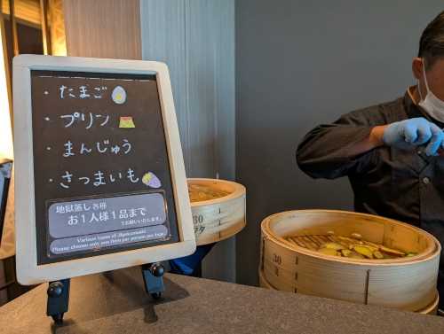 今宵の宿はグランヴィリオホテル別府湾。前に近くのグランドメルキュール別府湾に泊まってあそこも良かったけどこちらはどうなんだろうと興味津々で。なんとここのウェルカムドリンクは別府名物地獄蒸しと味わえる。別府の地獄蒸しってお店で食べるとなかなかの量で一人前なんてなかなか食べられない。ちょっとお試し的に食べてみたいと思ってたので願いがかなった!上に乗ってるのはお塩。さつまいも、ほっくりで美味しい~♪ブロッコリーもちょうどの蒸し加減。って一番期待してたお饅頭、ゆで卵、プリン♪♪♪↑ 一番って何個あるんだ。お饅頭はしっとりふっくらだし、ゆで卵も美味しく、プリンがまたとても美味しかった♪ドリンクは自家製梅酒と焼酎。勿論、ソフトドリンクもある。ここの席で本来なら食すのだけれど・・・。↑正面は別府湾。ちょうどチェックインの方が増え始めたタイミングだったので上のラウンジで食べさせてもらうことに。あ、足湯もあるんだ~、くつろげる設計になってるけど行ったのは7月、夕方と言えど外には出たくないので見るだけ。地獄蒸し、満足した~、ホテルメイドだからおしゃれっぽかったし。