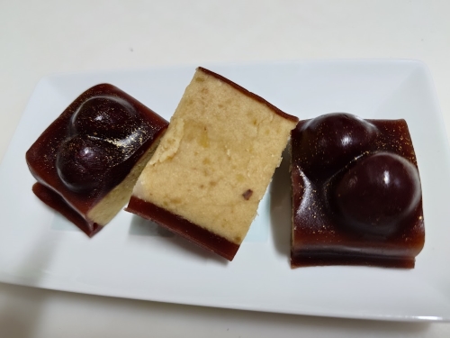 渋皮煮と栗きんとんを薄い羊羹で包んだお菓子。