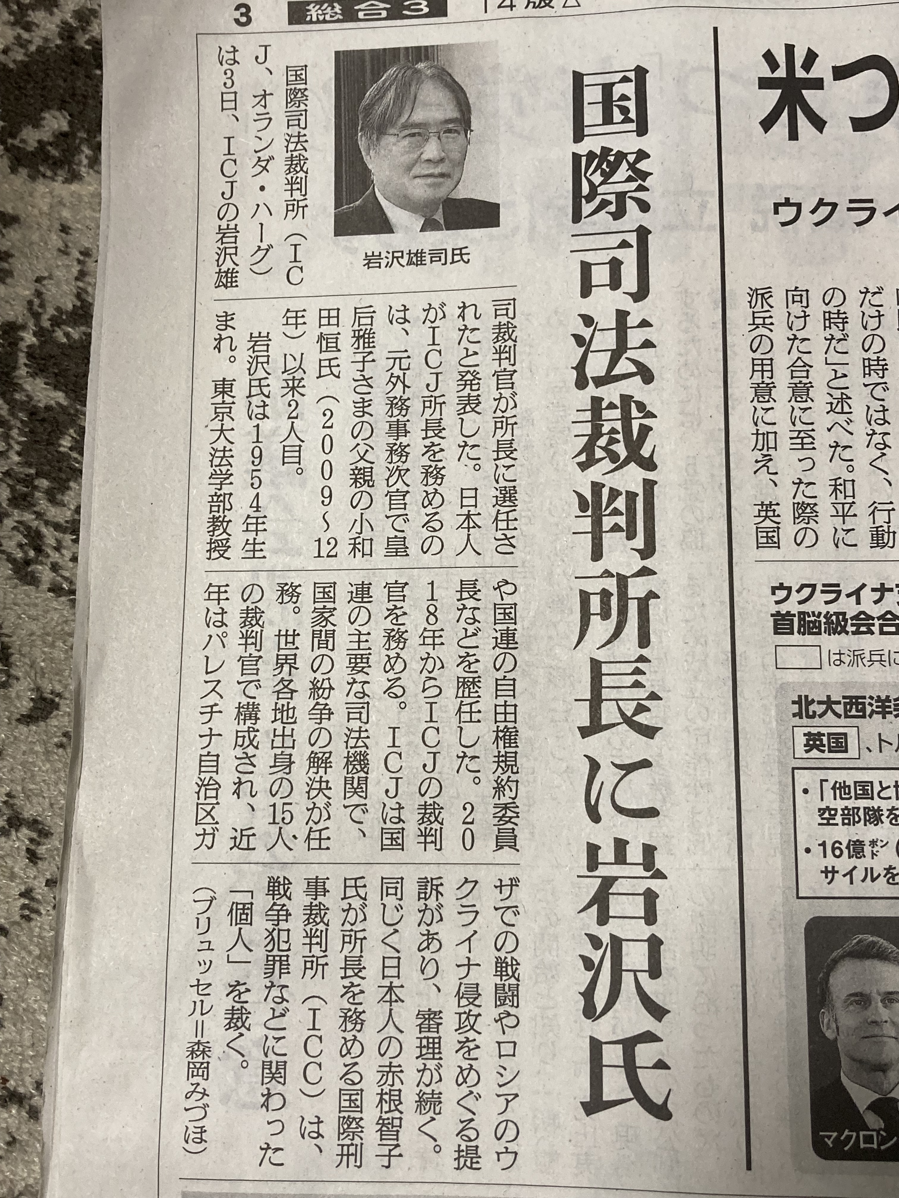 今シーズン初の積雪ですね〜❄️❄️❄️明日の朝は要注意ですね!3月5日、6日は第1の水曜、木曜日なので連休とさせて頂きます。ご迷惑をおかけしますが宜しくお願い致します🙇花粉と寒の戻りで体調を崩しやすいですがお互い気をつけてまいりましょう♪ オランダ在住のお客さんの岩沢さん(国立が自宅)の情報が新聞の記事にのってました!国際司法裁判所長に選任されたそうです!!