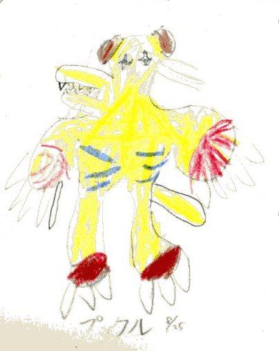 前からアップしようと思ってなかなか出来なかったのですが、これがプックルの初期型です。王子が変な犬がいると言った時、書かせてみました。爪はクリスタルで、口は大きい。眼はピカっと光っているらしい。これを最初に見たとき、デジモンか?と思ってしまいました。よく似たキャラがいるのですよ。あくまで、これは初期のプックルで、少しずつバージョンアップしています。今は、アニメ化が進んでいるらしく、長い鼻を短くして、爪も短くなったらしい。だんだん、かわいく自分を変えているらしいです。かわいい方が受けがいいと思ったのかどうだか知りませんが。確かに、この絵は少し怖いかも。色も今は黄色というより、金色でピカピカなんだって。今の顔はプーさんちっくな感じだそうですよ。それじゃクマじゃん、と突っ込んでみる・・・。このときは服を着ていませんが、今は自分の顔が書いてあるシャツを着ています。背中には羽があるんだけど、折りたたみ式になっていて、普段はしまっているそうです。ぬさりん坊さんのブログにも、カッパちゃんたちが、徐々にキャラを変えて行ったり、服を着せてもらったりというのがありますよね。どうやら、あれと同じ感じみたいです。自由に姿を変化させられるっていいよね~。私ももう少し細身に変化したいですゎ。