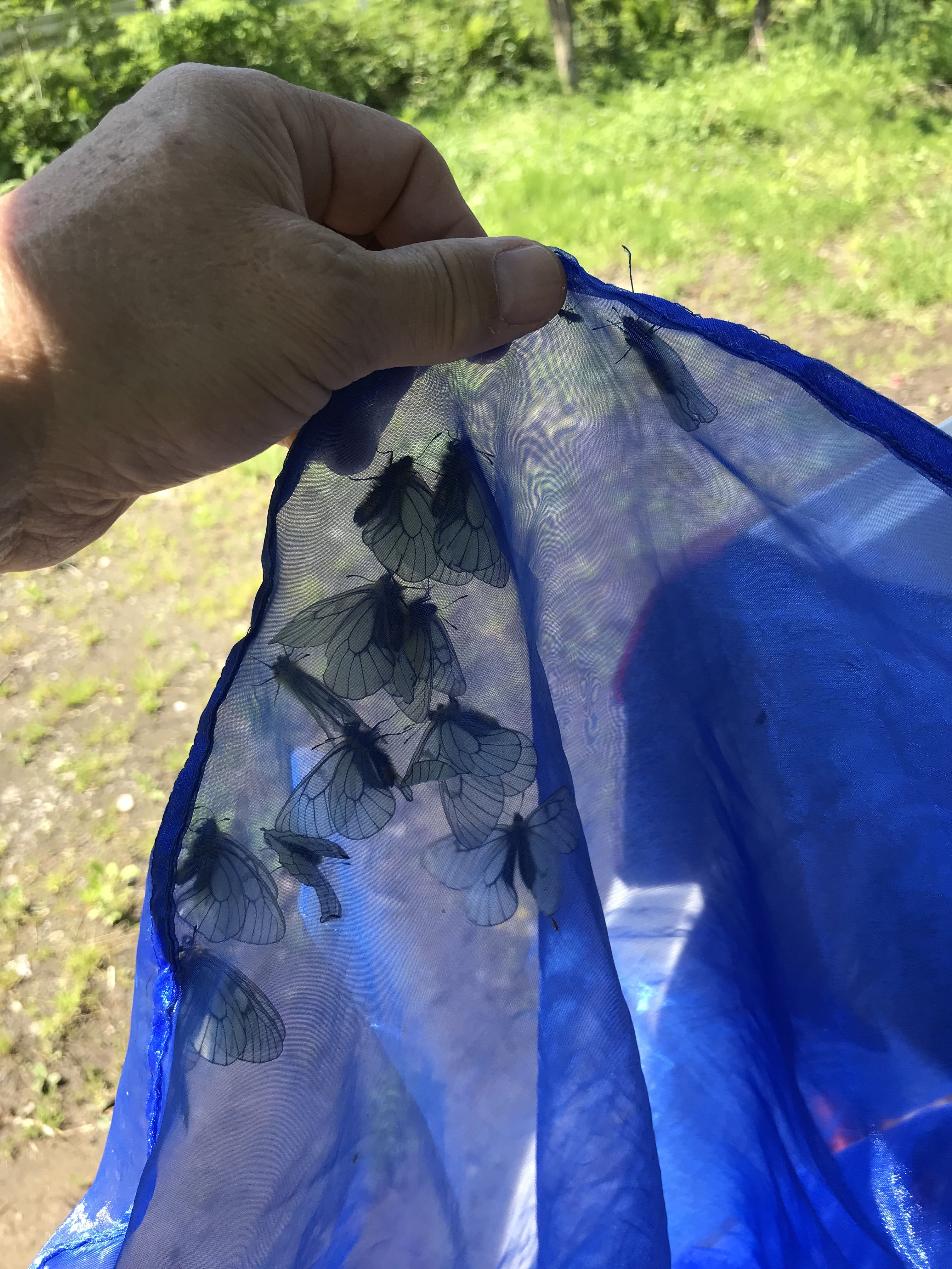 昨年少しまとまって飛んでいたポイントは田植えの車がたくさん止まっています 少しずらして道路沿いでふわふわ飛んでいるウスバシロを見つけました 最初は白い黒い関係なく手当たり次第のネットインでした ネットに溜まった中から白っぽいもの股グラの黒くないものを選んでいきます