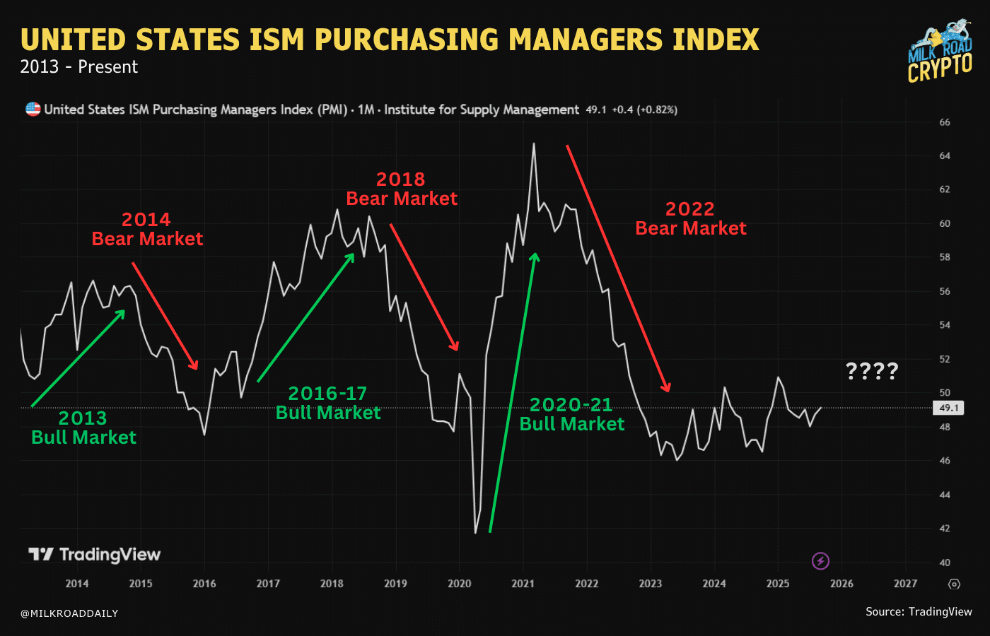 WHAT CONTROLS THE MARKET CYCLES?市場サイクルを動かしているものは何かFor those of you that are new to Milk Road Crypto PRO, I’ve been saying for years now that crypto cycles exist for the same reason cycles exist in equities, real estate and basically every other asset in the world.Milk Road Crypto PROを初めて読む方へ:私は何年も前から、仮想通貨のサイクルは、株式、不動産、そして世界中のほぼすべての資産に存在するサイクルと同じ理由で存在していると述べてきました。They exist because of the business cycle and the liquidity cycle.それは「ビジネスサイクル」と「流動性サイクル」故に存在します。I’m not going to go too in-depth on this, as I’ve covered it in detail before, so I recommend you read the following PRO reports if you’re not up to speed:この点について深くは掘り下げません。以前に詳しく取り上げたので、まだ理解が追いついていない方は以下のPROレポートを読むことをおすすめします:TThe Business Cycle and Crypto Cyclesビジネスサイクルと仮想通貨サイクルGlobal liquidity and cryptoグローバル流動性と仮想通貨But essentially, on the liquidity side, as more liquidity is created and put into the system, the value of fiat currencies debase against scarce assets like Bitcoin, Real Estate, Gold and stocks. I think many of you already understand this concept.基本的に、流動性の側面では、システムに流動性が多く供給されるほど、法定通貨の価値は希少資産(ビットコイン、不動産、金、株式など)に対して減価します。この概念は多くの方がすでに理解していると思います。The part I think is less clear to many is the business cycle side of things.私が思うに、多くの人にあまり理解されていないのは「ビジネスサイクル」の側面です。The business cycle is essentially the cyclical nature of the contraction and expansion of the global economy. As the economy expands and businesses get bigger and more profitable, the price of assets related to them increase, as more people have more money to invest and consume. Of course, as the economy contracts the opposite is also true.ビジネスサイクルとは、世界経済の拡張と収縮の周期的な性質のことです。経済が拡大し、企業が成長して利益を上げると、それに関連する資産の価格も上昇します。なぜなら、より多くの人々が投資や消費に使えるお金を持つようになるからです。もちろん、経済が収縮すればその逆も真実です。The ISM PMI is one of the most common ways to understand where the business cycle is. Generally, we want to see this metric accelerating for markets to be risk-on, especially when it’s above 50 (this means the economy is expanding).ISM製造業購買担当者指数(PMI)は、ビジネスサイクルの位置を理解するための最も一般的な指標のひとつです。一般的に、この指標が加速しているとき、特に50を超えているときは、経済が拡大しており、市場はリスクオン(積極的な投資姿勢)になります。The opposite is also true, as we see more risk-off in markets when the ISM PMI is dropping.逆に、ISM PMIが低下しているときは、市場はリスクオフ(慎重な投資姿勢)になります。Source: TradingView 出典:トレーデイングビューFor the last 3 years, the ISM PMI has struggled to accelerate and sustain above 50. The main reason for this in my opinion is that financial conditions have remained rather tight with rates, DXY and Oil sitting higher for longer.過去3年間、ISM PMIは50を超えて加速し、それを維持するのに苦戦してきました。私の考えでは、その主な理由は、金利、ドル指数(DXY)、原油価格が高止まりしており、金融環境がかなり引き締まった状態にあるからです。However, Tomas, our macro genius at Milk Road Macro, created his own proprietary metric to track the business cycle called the Global Economy Index. This metric is more ahead of the curve in terms of expressing where the business cycle is versus the ISM PMI which is a monthly survey.しかし、Milk Road Macroのマクロの天才・Tomasは、ビジネスサイクルを追跡するための独自の指標「グローバル・エコノミー・インデックス」を作成しました。この指標は、月次調査であるISM PMIよりも、ビジネスサイクルの位置をより先取りして表現するものです。This metric tells us a little different story, which is that we’ve already completed a mini business cycle and we’ve now started a brand new one.この指標が示しているのは少し違うストーリーで、私たちはすでに「ミニ・ビジネスサイクル」を終えており、今はまったく新しいサイクルが始まっています。Source: TradingView 出典:トレーデイングビューIf you remember late Q1 2025 before ‘Liberation Day’, we were in a bit of a growth scare. Meaning, the business cycle was heading the wrong way after a push forward at the end of 2024.2025年第1四半期の終わり頃、「解放の日」の前を思い出してください。あのときは少し成長懸念がありました。つまり、2024年末に前進した後、ビジネスサイクルが逆方向に向かっていたのです。When Trump announced global tariffs the business cycle fell off a cliff and according to our Global Economy Index indicator it completely reset in such a short period of time, meaning, it technically started a brand-new cycle.トランプが世界的な関税を発表したとき、ビジネスサイクルは崖から落ちるように急落し、私たちのグローバル・エコノミー・インデック