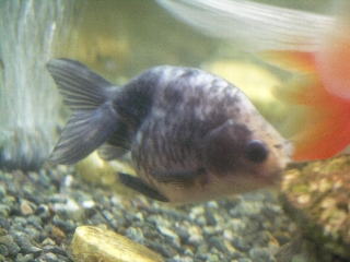 変色中のミルクホワイトランチュウですが、ついにこんな風になってしまいました。TT↑ランチュウ体型のフナ?><;昨年☆になったキャリコも、夏場の高水温期に黒く変色していましたが、この子もそうなんでしょうか?いっその事、真っ黒になってしまえば黒ランチュウという事になるんでしょうが、今のままだと中途半端ですねぇ。。。TTこの先どう色変わりしていくのか、不安と期待が入り交じりつつ、経過を見ていきたいと思います。^^;