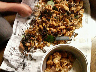 近所の人にさもだし貰った。すごく大量。ばあさんがゴミ取り中↑。「さもだし」は古いりんごの木に、モリッとはえるらしい。それをリンゴ農家のご近所さんが、てきとーにモサッとつかんで持ってきてくれます。地元では「さもだし」って呼ぶけど、ほんとうは「ヒラタケ」っていうんだってさ。(ちょうど今テレビでやってた)調べたら「なら茸」だった・・・耳で聞いた情報はあてにならないですね。空耳だらけ。