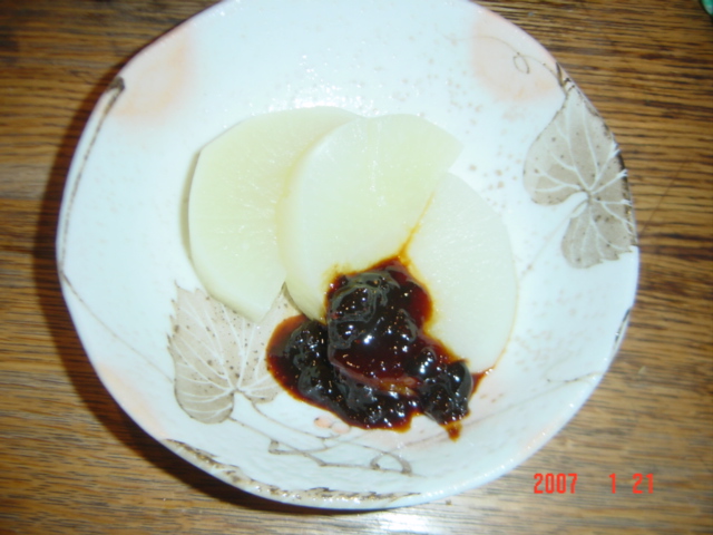 お隣から大根を頂いて、今日は大根をコトコトにて田楽味噌をつけて食べることにしました。八丁味噌をベースにした濃い口のお味噌です。ちくわのヤマサが作っている味噌ですが、楽天には無かったです。お昼にそばをゆでて食べたのですが、蕎麦湯が残っていたのでそれで大根をゆでました。我ながらいいアイデア深みのある甘さでおいしく茹で上がりましたよ。米のとぎ汁でゆでると苦味が出ないとよく言いますので、それがヒントです。そばの栄養も加わっておいしく茹で上がったと思います。みなさんもそばをゆでたら、大根もゆでてみてくださいね。ゆず味噌でもおいしいですね。母の実家のある豊橋には有名な「菜めし田楽」のお店きく宗があります。お墓参りの帰りによります。お店の雰囲気もよく、大根菜を混ぜた菜飯もおいしいです。大根の葉っぱをさっとゆでてみじん切りにして炊き立てのご飯に混ぜます。お弁当にもいいですよ。とてもおいしいです。