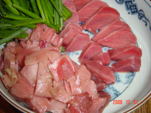 明けましておめでとうございます。本年もどうぞよろしくお願いします。もうかれこれブログも丸3年になりました。大晦日は、あいさつ回り。おざさの最中を持って、お世話になっている方を回りました。おざさの最中はおいしいので、毎年好評です。夜になって、おいしいマグロとうにで年越しです。私の住んでいる地域は、魚は絶品です♪まぐろも落しがおいしかった!(左下のほう。赤身のサクよりもおいしかった)うには北海道のウニです。ちょっと高いけど、外国産はミョウバンがきつすぎるので、必ず国内産を買います。塩水ウニがミョウバンが入ってないのでおいしいです。夫はなまこが好きなので自分で調理。落としを取った残りの筋はから揚げ粉でから揚げに。こうすると、余すところ無くマグロを使い切れます。子どもたちは酢だこも好き。そして大晦日の夜はK-1を見て(みんなが見るので私も見るようになった。今年は面白くなかった。元気が引退しちゃうのは寂しい。入場シーンが見れないから。)。0時には窓を明けて港の汽笛を聞くのが我が家の年明けです。一斉に停泊中の船が汽笛を鳴らすので、ボーボーとよく聞こえます。イベントもあるらしく、花火が上がっていました。元旦の朝は、思いっきり寝坊しました。9時に起きて、お雑煮を作ります。今年は三浦大根とにんじん、地鶏で作りました。器は、滅多に使わない漆のおわんです。木彫りの古いものだと思います。そして定番、ヤマサのちくわ。豆ちくわが我が家では人気です。本当においしいよ。そして夜は手巻き寿司。これは、馬刺し。スーパーで安くなっていたのを買いました。大当たり!!めちゃくちゃおいしかった~。そして地だことマグロ三昧。この部分は落としなんですよ。実は一番おいしい。そして今日は残った部分はにんにくとオリーブ油でステーキにしました。昨日切ったタコを使ってマリネも。散らしたゆずは、庭で採りました。今年は大豊作。巷では不作だったのに、我が家のへそ曲がりゆずは豊作でした。明日はババサマの家でお料理担当です。黒豆と三浦大根とばら肉の煮込み、マリネ、ちくわ、そして刺身などもって行こうと思います。おせちはいつも親戚から真空パックのが届いていますので作ってません。そんなわけで、今年も相変わらずの食いしん坊ブログですが、よろしくね