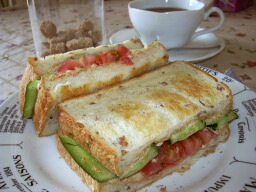 胚芽入りのパンにぬりトマトときゅうりはさんで