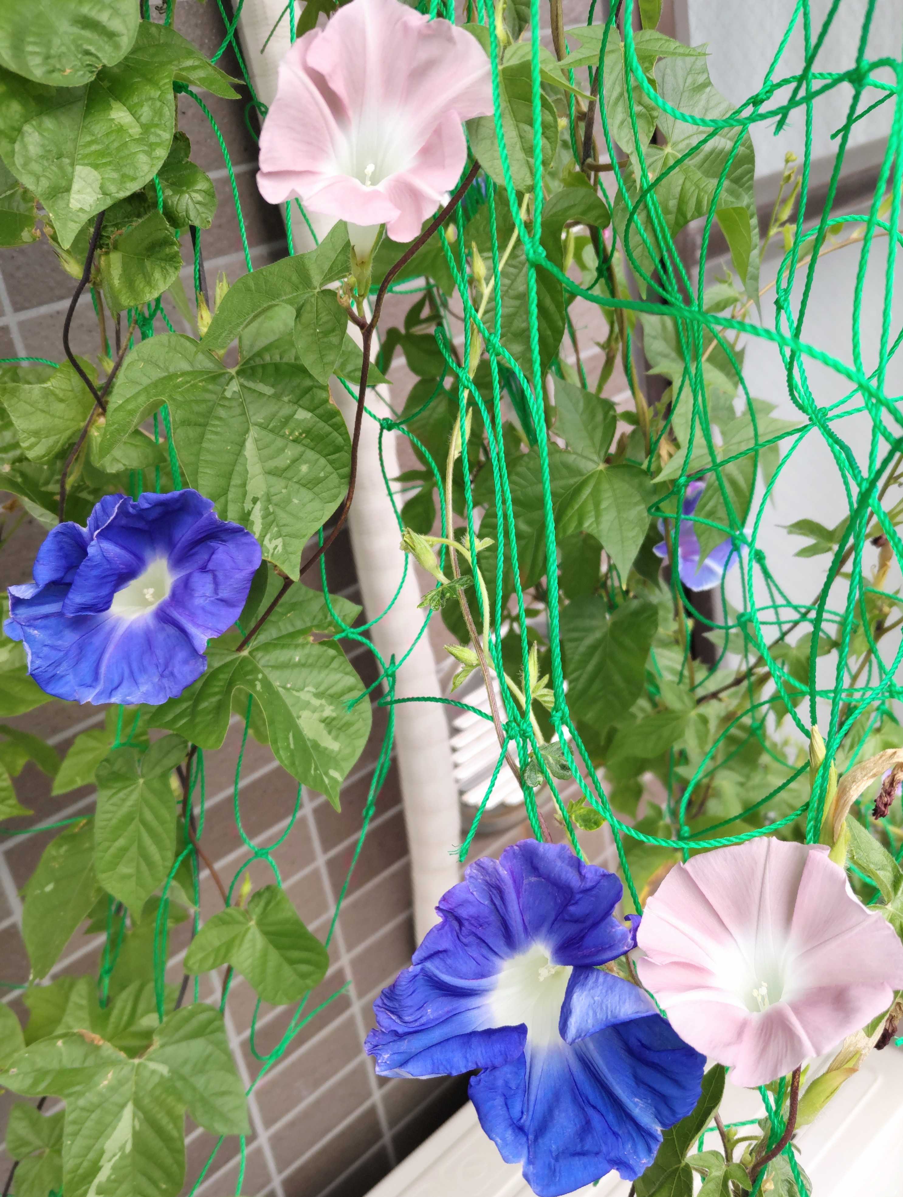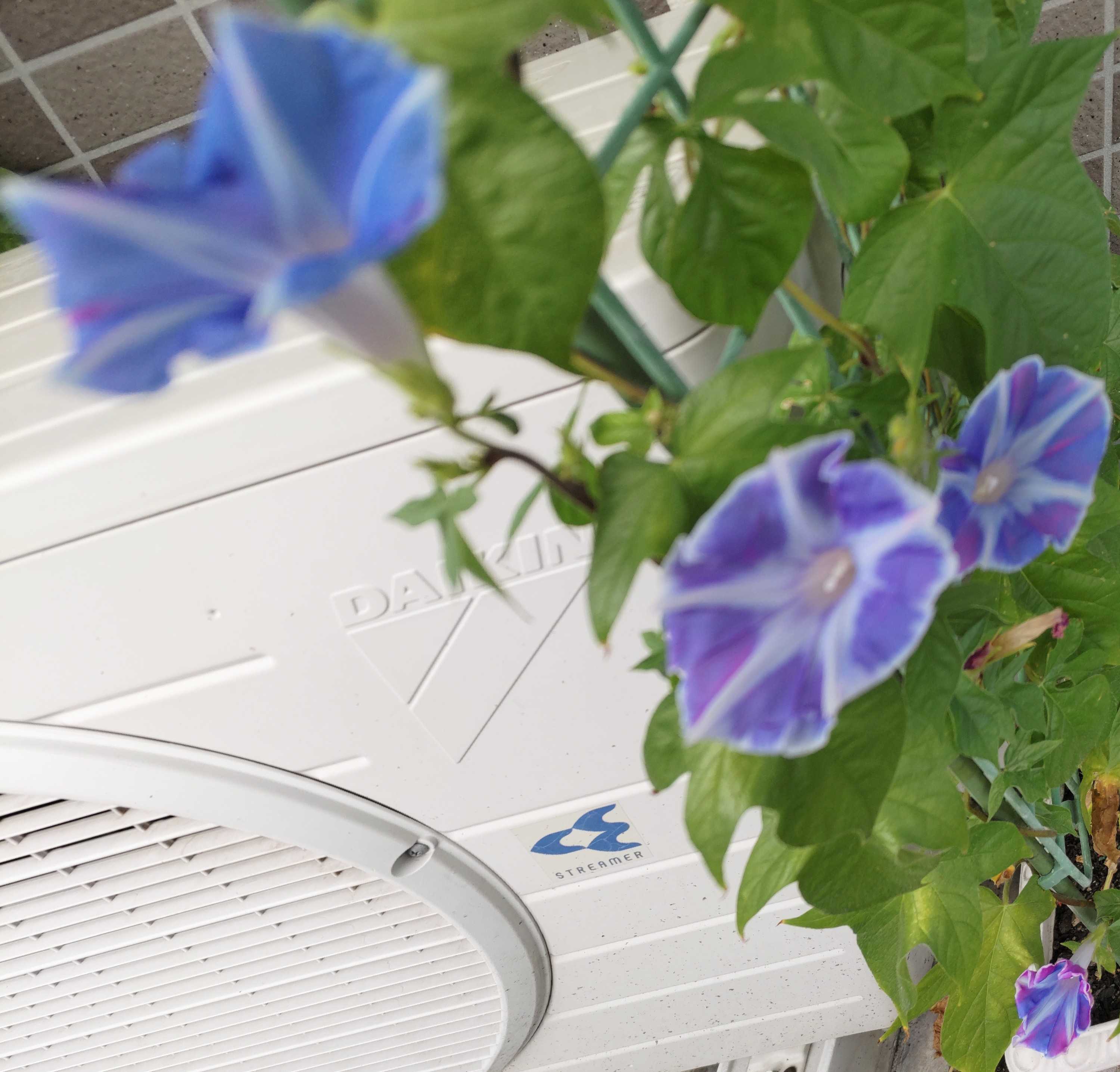 ここ2~3日は開花数がそんなに多くなかったけど、今日は25輪と開花ラッシュがまた来た。薄ピンクのアサガオが半数だったけど、赤ピンクや暁の海(写真3枚目)もまだまだ頑張ってくれている。エアコンと同じく、頑張れアサガオ!