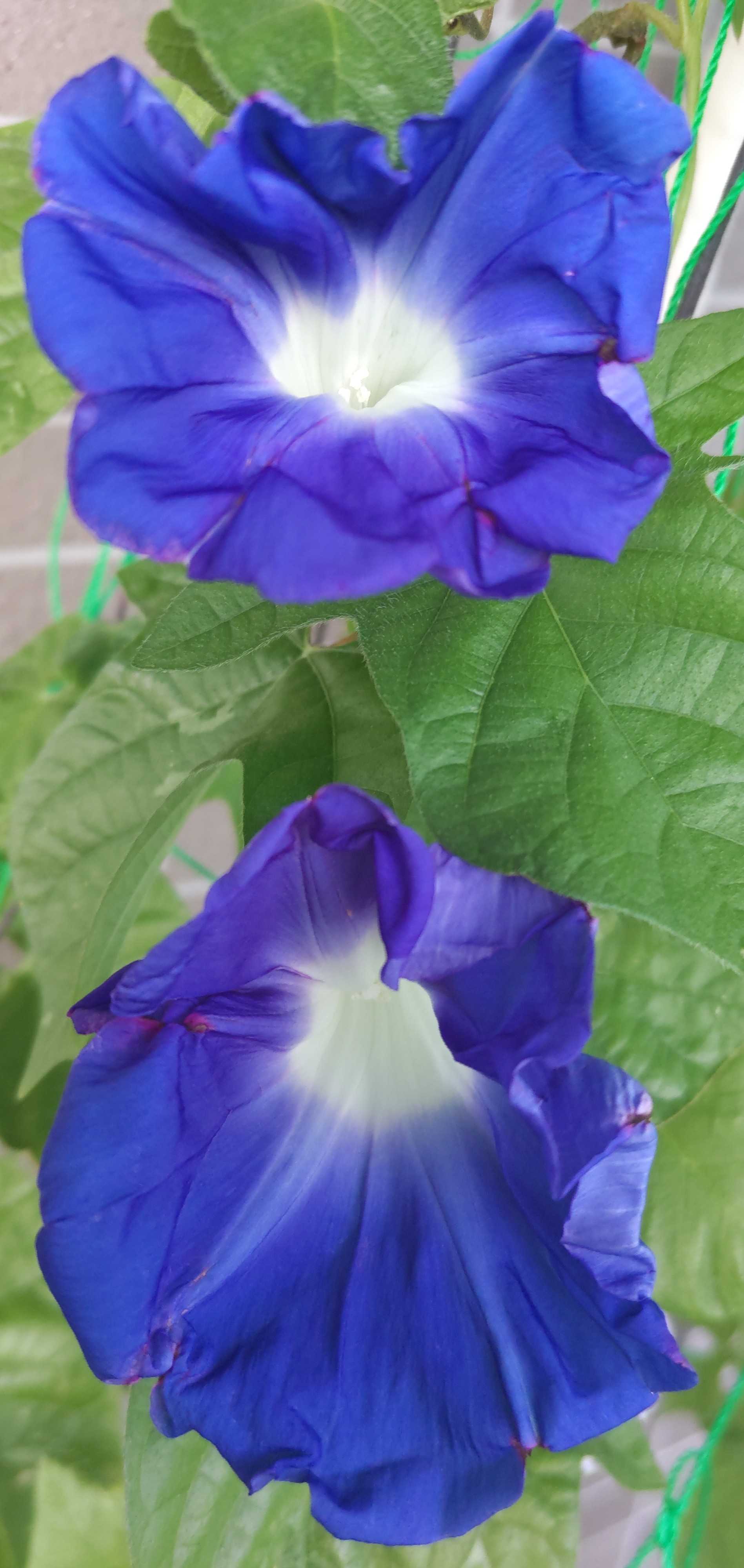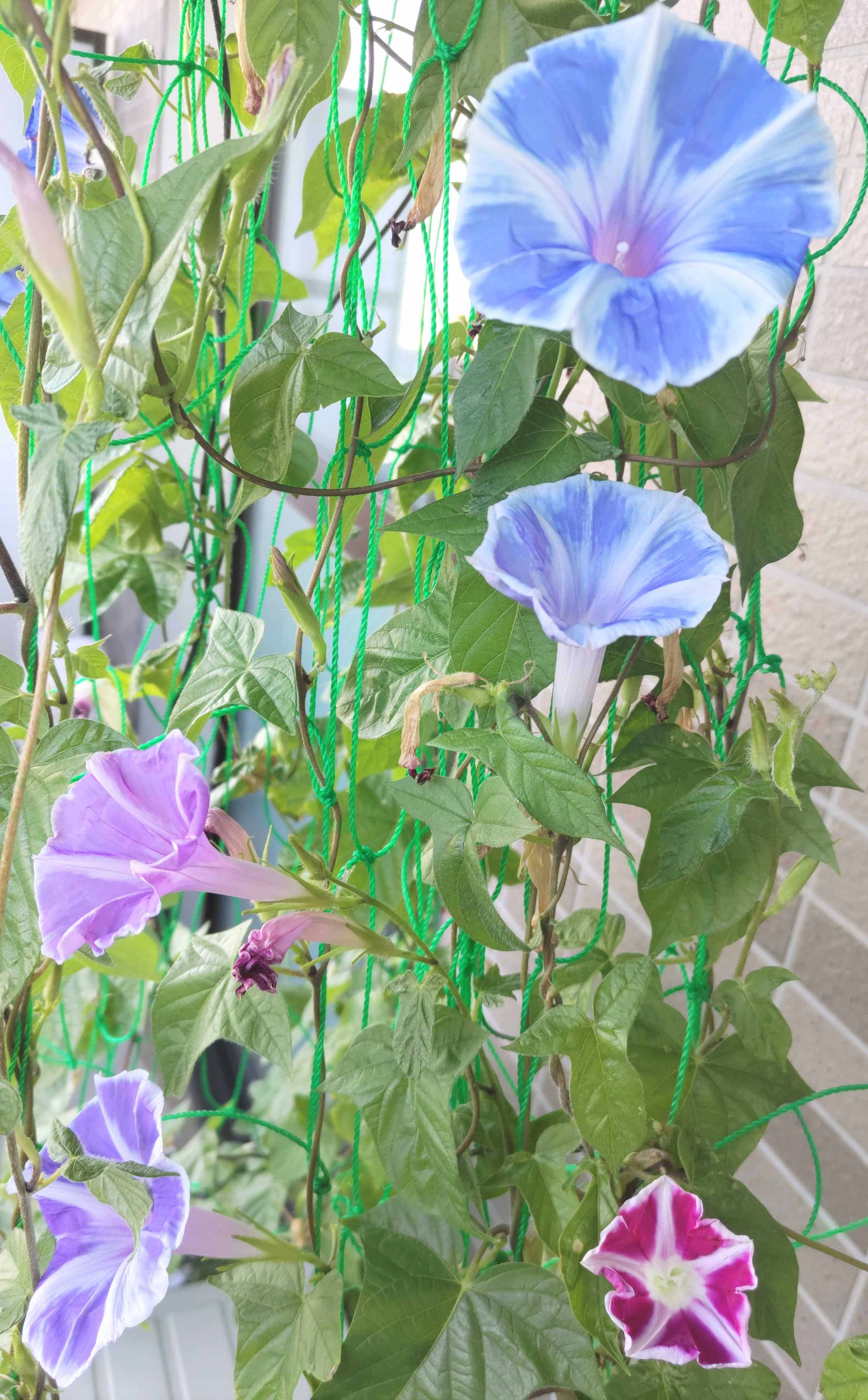 久しぶりに、かすり模様の紫アサガオが開花したのが嬉しい。