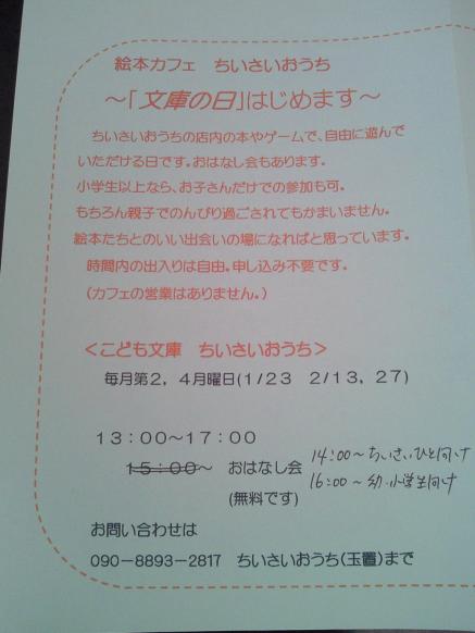みなさん、風邪などひいてませんか小学校も中学校もインフルエンザや胃腸炎、流行っているみたいです。手洗い、うがいをして、たくさん食べていっぱい寝て風邪菌なんか寄せ付けない体をつくりましょう以前、プチママンで羊毛フェルトを教えて下さっていたちいさいおうちさん カフェをオープンしたことは、お知らせしたのですが・・・今回、[文庫の日]を開催するそうです。詳しいお問い合わせは 090-8893-2817 ちいさいおうち(玉置さん)まで外が寒い日は、こんな素敵なカフェで可愛いおはなしを聞いて、親子でほっこりするのもいいもんですよ。ちいさいおうちカフェさんは、あたしのお気に入りカフェの1つです。明日のヨガ 参加者多数のため、車を乗合いしていただくか詰めて駐車のほど宜しく御願いします。 まる