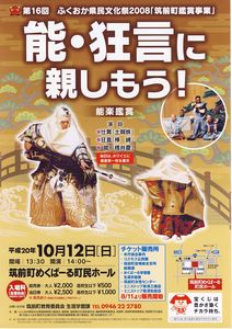 仕事がバタバタと忙しくなるとあ~、のんびり能が見たい!!と思ってしまいます。あまり詳しくないので、よく判らないのですがあの現実離れした幽玄の時間が大好きです。で、見つけてしまいました「能・狂言に親しもう!」日 時 2008年10月12日(日)14:00開演/13:30開場 会 場 筑前町めくばーる町民ホール (福岡県朝倉郡筑前町久光1014-2) 入場料 大人 2,000円/高校生以下 500円 *全席自由* 当日は500円UP プログラム 仕舞「土蜘蛛-つちぐも-」 鷹尾章弘 解説 鷹尾維教 狂言「棒縛-ぼうしばり-」 川辺宏貴 -休憩- 能「橋弁慶-はしべんけい-」 山崎正道 アフタートーク 大人2000円、子ども500円?嬉しいなあ~丁度子ども達も秋休みの時期だし早速チケット購入しよう!と、手帳を開いてガックリ地区の運動会の日でしたう~ん、残念 行きたいな~(涙)