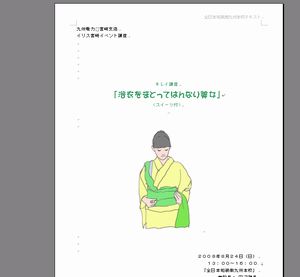 ようやく、ゆかた着付けのテキスト出来上がりが見えてきました^_^;いや~、我ながら、よく頑張っている(パチパチ)そしたら、九電さんから連絡がありまして今回の受講者なんと 5人・・・なんだそうですいいえ、たったヒトリでも受講者がいらっしゃれば心を込めた内容で、いたしますがでも、せっかくここまでテキスト頑張ったんだからもう少し参加者増えてくれると嬉しいな~ということで、再告知です^_^;キレイ講座(着付)「浴衣をまとってはんなり美女」 開催日: 8月24日(日)13:00~16:00 講 師: 田辺雅晶(「全日本和装南九州本校」主宰) と Qちゃん(ふふふ)参加費: 500円 定 員: 20名 持参品: エプロン,浴衣,腰紐2本,伊達締め,帯板,タオル3~4枚,半幅帯,できれば和装用下着 ★立ち振る舞い、マナーを学んで「夏の夜まつり」へ ・・・九州電力 宮崎支店さんのHPより抜粋・・・・浴衣の着付けを学べて、IHクッキングで作ったスイーツも食せるという一石二鳥な催しです。今からの申し込みで受け付けていただけるかどうか判りませんが、お一人でも多くの受講者が来て頂けると、嬉しいです。初心者でも、そうで無い方でも楽しめる内容だと思ってますお友達、お知り合い、家族、親戚お誘い合せの上、いらしてくださいませ~(涙)