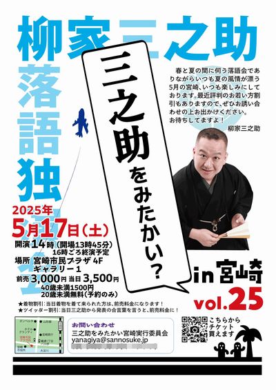 九州南部が梅雨入りしたそうです今年は沖縄や奄美よりも早い梅雨入りで全国で最初の梅雨入りですってそんなに早く梅雨入りしてくれなくても良かったのに・・・これから、しばらくはお天気が気になる毎日になりそうですさてさて、明日5月17日(土)は私が実行委員長をしております「三之助をみたかい? in 宮崎 vol.25」が開催されます当日キモノを着ていらした方は前売り料金です40歳未満の方は、半額です20歳未満の方は、無料です(予約のみ)「三之助をみたかい?」in宮崎 vol.252025年 5月17日(土)開場13:45 開演14:00(16時頃終了予定)場所:宮崎市民プラザ 4F ギャラリー1木戸銭 前売り:3,000円 当日:3,500円当日ツイッターの合言葉を言われた方も前売り料金ちなみに、翌5月18日(日)は宮崎のブルーパブ「宮崎青空エール」ではビールを飲みながらの落語会というのも企画されています週末は「宮崎で落語!」いかがですか?