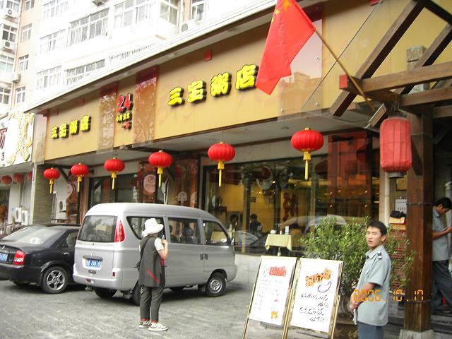 安いのか高いのか、判らないのはちょっと怖い気がするが慣れなくちゃ。ね!。口に合うのか、ダメなのかも判らないので、まず 一般的な中国料理名でいくしかない。チンジャオ・ロウス、 16元。 酢豚・タンツウリジ、18元。エビ・シャー、トリ・ジロウ,など入りの粥15元。 昼だからビールをやめてジュースにした。これが大変高かった。500パックそのまんま、でてきた。22元。ジュース2個はチンジャオロウスと酢豚合わせたより高い。合計で120元支払った。〆て1800円也。本場中国の酢豚は味が甘くて 肉・にく・肉だった。日本の酢豚は肉を探すけど、本場の酢豚は野菜がない。下にレタスを敷いたものが野菜。チンジャオロウスは肉に青ねぎ、青菜の混ぜたもの。とても美味しい。麺の粉をクレイプみたいに包んで食べる。店には水槽に鯛や貝、あわび、蟹等ディスプレイされていて注文してつくってもらえる。バイキングの様に4元で自分で取り皿に取ることもできた。珍しいので思わずカメラを向けると、ダメだと言われた。これが売り、だからね。一人前 900円で満足した。 しかし二度とジュースは注文しないと決めました。 紙パックの梨ジュースが660円もするなんて考えもしなかった。500ミリリットルサイズがですよ。勉強、勉強。