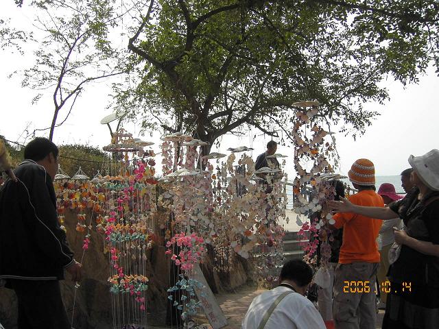 木の葉が秋風と共に舞い落ちる。落ち葉の道をゆっくりと歩いていくと、落ち葉の粉砕する音しか聞こえてこない。・・ なーんてロマンチックな文章がうららを誘った。しかし、海浜公園は落ち葉一つ落ちていない。きれいに清掃されていて、落ち葉の取り残しが、かろうじて、低い植木にひっかかっているくらいだった。チンタオ市の環境保護の力の入れようが伺える。浜辺でリクレーションして盛り上がっている若者たち。貝殻でつくった風鈴10から30元で・浜辺をディスプレイ。