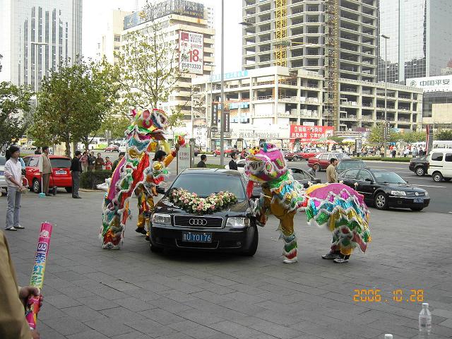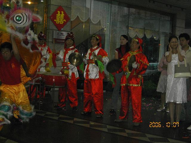 中国でも日本と同じく、お日柄と言うものが有るらしく、結婚式の新郎新婦を乗せた車が引っ切り無しに通うる。 まず一組が入場する。鼓笛隊の演奏に出迎えられてバラの花びらを振り掛けられながら、ホテル内に消えていった。 あっという間にホテルの玄関は、次の組の準備に入る。お出迎え親族友人達は、二組分のギャラリィで入り口をうめ尽くしていたが、初めの新郎新婦と共に人数は減った。、 後から式を挙げる組は伝統的結婚式でお金を掛けた結婚式と分かる。オープンだから家の格差がはっきり出る。であっても二組ともいま一番幸せな瞬間であろう。 伝統的な結婚式・一流ホテルで挙げる。