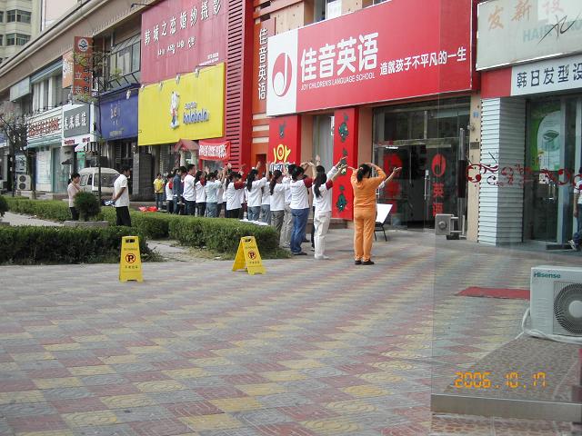 公園広場では、凧揚げの凧を 筒型の袋に巻いていれ、自転車で出勤してくる。 貸し凧の仕事をしている人は、ざっとみて6,7人もいた。自分の凧を揚げて見せ どう?やって見ない! と営業開始。 中国料理店では、夕食時間に合わせ、外の公共通路に従業員全員整列して ゲキをとばす。繁盛していれば、従業員の数ざっと3、40人。みごとに4列縦隊に並びリーダーに復誦 幼児英才教育クラスの若い指導員に ネームの入った同じTシャツを着せて、公共街路で踊りを指導している外国人。踊りが記憶を助けるという発想なのだ。だがしかし、指導員が踊りを、覚えていない。 だいじょうぶかな、ここで英語を学ぶ子供たち。やや疑問だ!。 がんばれ!姉ちゃん、 兄ちゃんたち。