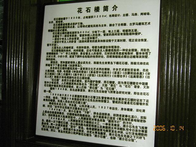 紅葉はまだ、まだ。秋風もまだ、まだ。ちょっと期待した油絵みたいな色鮮やかさは、万国建築博覧館という名をもつ個々の別荘群のみ。これはすばらしっかった。この別荘を取り巻く木立が色づいて、初めて絵になる散歩路となる。青島駅から10キロ、タクシーで10元位。バスで1元です。空港からならタクシーで60から80元位。 蒋介石の別荘・花石楼は5元で入園できる。 古い掛け軸、花瓶、木製のベット。亡き蒋介石が使用したという小さな館から周りをぐるっと、見てみて!。第二海水浴場から見た八大関と花石楼全景。