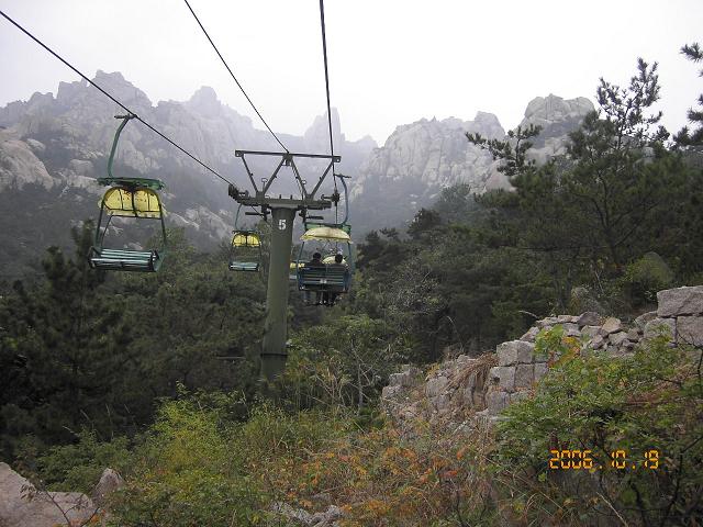このところ、チンタオはガスがかかる。雨かも知れない空模様だった。高所恐怖症のうららは一日遊覧バスツアーに乗ったので、リフトに登るしかなかった。もーう、怖かった。すぐ足の下に 木のてっぺんの葉が、触る。洞窟の中もひたすら上に向かって石の間をくぐりぬける。1100メートルの高さだ。ときどき岩の間から下界がのぞく。足場は 鹿じゃないってなぜこの狭さ、体も足も曲がらないよ、って愚痴りながらひたすら登る濡れた岩。まるで石のはしごです。後悔しても進むしか有りません。 やがて、一天という 高い所に出た。あとは下るだけ。リフトに乗って下るだけ。何故か怖くなかった。下を見ると其処はもう ピーターパンの世界だった!