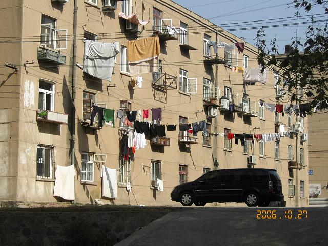 日本の市営団地とほぼ同じ創りの居住区・一区画、大抵塀で囲まれていて、号数の少ない方から建てたので、数の大きい程外見がきれい。 チンタオ駅から東に移るほど、新しく建てたマンションが色や創りで< 一区画を小区と言うのだが >小区と小区の境がわかり易い。西に平屋・戸建ての旧ドイツ風建築群が見られる。木立に囲まれ、並木道を散策すると、ここがどこか別の国・ヨーロッパの住宅地の中を歩いている様な錯覚をする。西から東、北と発展し今や建築ラッシュ状態です。 驚くことに、この地では、外壁の手入れを全くしないので、海が近いこともあって老朽化が早い。うららは神奈川県に住んでいるが、2,3十年経った日本のマンションの外観と7,8年のチンタオ・マンションと外見は、ほぼ同じ。無論家の中は持ち主によって、外観と不似合いな程きれいだが。 チンタオ人の中流家庭のアパートでは、向い側の階段の柵に滑車を取り付けロープを渡して洗濯物を干す。 天気のよい日は一斉に、洗濯物が風に吹かれて、万国旗みたいにひらひら舞う。この眺めこそ、中国の、中国人らしい一般家庭のスナップです。