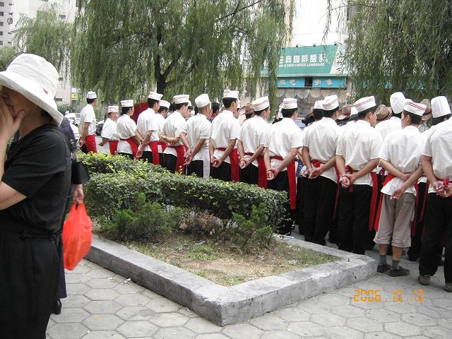 大通りで4時半頃になると、 老舗の中国料理店の全員が最も目立つ通りに出て、整列して気合をいれる。東京でも四月入社間もない新入社員を駅前で 大声で怒鳴らせ、恥ずかしさを吹っ飛ばせている社員教育を見たことが有るが、 もっと整然としていて、会社の朝礼みたいなものに近い。今日はざっと40人はいる。みごとなものである。 服装からして一目で料理店のコックとわかる。運ぶ人、レジ、そして支配人、皆役目による区分けが服装で統一されていて、唯一黒のスーツを着ていたのが若い女性の支配人だった。訓示があり、復誦があり、開店前の気合に見える。写真を向けるのに気兼ねした。