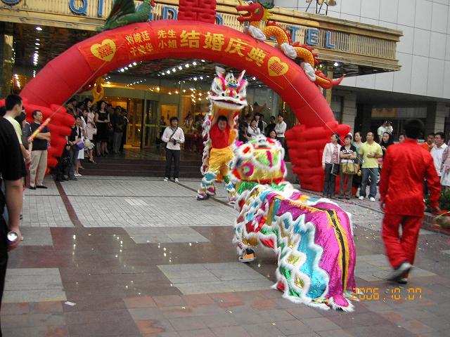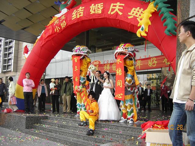 伝統的結婚式は盛り上げ仕事人イベント会社達人がいる。 ここでアクロバット、ここで、名演技披露。 ちょっと、花嫁さん ここで待っててね! 仕掛け人がテープの吹雪を飛ばしたり、バラの花びらを振りかけたり、お祝いの垂れ幕を下ろしたり、たり、たり、たりの順番に沿って進行する。2組の獅子舞は肩に乗ったり、アーチになったり、まるで組み立て体操のよう。盛り上がった所で記念撮影。花嫁さん思わず、ガッツ・ポーズ!。