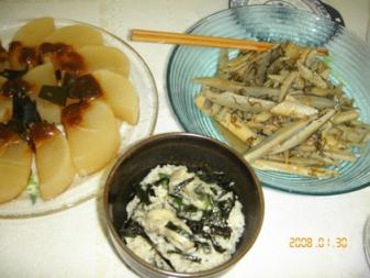 牡蠣ご飯を所望した うららの夫のために アオ空市場に買い物 目当ては 牡蠣・・殻付が あっちでも こっちでも やまずみです・・・一通り 路・両側の エビ 牡蠣 あさり ひらめ カレイ 鯛 鯉等を 見て歩く 足を止めて 剥いた牡蠣を600グラム買った・・・ 300グラムでいいのだが・・一斤が・・単位・・ 500グラムなのだ・・ まあいいか1斤でもと注文するすると・・ オバサン ・・入れる入れる・・どんどん入れる この手の商法が普通なのよだから・・こういう時は バン・1斤の半分と 言った方が良かったワ水物だからね・・コスさも・・だんだん出てくる それが見えるのよ ヤダネ もう 充分だと 大声で言う・・ と やっと 入れ込みを止めるオバサン達だ仕方がない 牡蠣カキ入れ時だからね うフ・・でも・・いい牡蠣 ぷりぷりの大粒だ春菊が有ったので・・少し 電子レンジでチンとして混ぜました 牡蠣ご飯 (三つ葉があれば・・最高)大根を 蒸して後 薄味(すぐ染みる)・・・ ミソの倍の量のみりんでタレを(鍋で煮る)ふろふき大根 ( ミソ 赤だししかない)レンコンが(大100円)皮むき後 たて切りで金平風に炒め煮 レンコンの金平 (青海苔がないので代用根昆布)さといも も 塩蒸しにして 甘辛しょうが煮のブタ肉と 混ぜ合わせる さといも煮ころがし黒豆と 菜の花のつぼみのおしたし主人のお客さんの為に 洋ナシのタルト業務用 干し柿(山程買い込んだ)吸い物は お客さんの顔を見てから・・ただ今 ほそ火で・・保温中豆腐 えび 残りの牡蠣 を入れたけんちん汁風に・・・・とろみをつけた濃い 出し で中国では 客の顔を見てから 作り出す・・熱々でなければ・・料理では有りませんが・・うららは日本人 メイクワンシ だ・・熱々は ご飯と吸い物 だけ だよん~ 後は 顔を見て 電子レンジで チン!これを うららは 失礼ながら・・ チン客 という