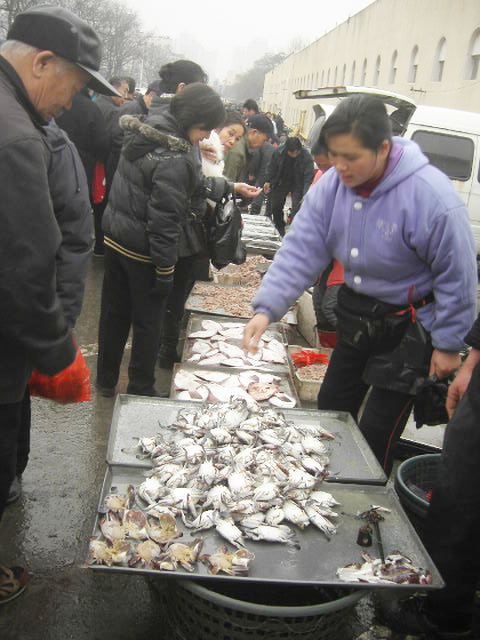 中国の 自由市場の魚売り(路上市場) 昔ながらの 竿ばかり ↑ 今は ヒラメ カレイ エビ 太刀魚 カニ 小さいサバ が多い まだ 活きている魚は 路上で動き回っているのに 売り手はお構いなし アナゴも 活きていました チンタオは 昔から よい漁場として有名だったそうで・・ 豪邸のマンションの持ち主にひと昔前の漁師で 今大金持ちの大臣(だいじん)という人が多いそうで・・・ ? 鯛やヒラメ イサキ 黒鯛 サメ 鯉 甲いか やりイカ ホタルイカ 名前の解らない・・やたら大きい魚 も 多いドレも ・・・・・一匹 高くても 4~500円で買える 安~いヨー! 100元出すと 濡れた汚い紙幣のお釣りが還って来るので 小銭を用意する! 他・・ 牡蠣 あさりは有名だそうですよ 大抵 魚とは別の所で売っています この自由市場 朝8時半には 終了で 後は姿も形も有りません 只の駐車場 魚売りは・・・早朝 市場で仕入れ ココで一時 売って・・・ 自分の店(小さいスーパー)に 帰って行くのでしょう ね 或いは・・どこか決まった売り場 ・・・・ 路上 が 有ったりして ?中国には ・・・平屋建ての日本のような個人の店(魚屋)って 有りませんからね ・・・ 土地は 全て国のものですから・・・ライトバンさえあれば どこでもお店 魚屋ができますのよ