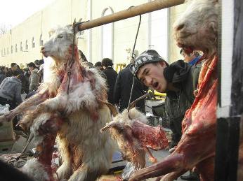 朝市は 産地直送で ・・・ 農家から車で ・・・ そのまま持ってくる野菜 果物 の集団売り場 水揚げした 魚介類だって新鮮で 間々活きているのが 売りですよ カニ エビ シャコは活きている この上なく 新鮮 です 中国では宴会など おもてなしに 養殖のコイを丸ごと料理して よく食べます 簡易な いけすで 泳いでいます 肉も ウサギや 野ハト 鶏 など 活きていたりして・・・肉までに到達していないのに・・売っている 新鮮 すぎますよ 豚肉は 解体した後の 塊のまま 吊るして 売っているが お望みの 部分のブロック売り って訳です 奥様! ヤギなどは まだ 解体していないんだわ~ほら 皮付き って 毛が付いています ここで・・・気の小さい人は 飛ばして下さい 目をつぶって 一気に下まで ほれ 写真だから ↓ スルー する 責任持たないよ ! どこでも売りますよ と言う感じで ・・・ ヤギを吊るしてある 脇に 白いビニール袋の小さいのが下がっている毛と皮 も売るんでしょう か ? 中国人は 見慣れている市場の 肉売り場ですこれ 普通なんですよ でもね・・・青空市場では 肉を買うな!! と中国人が注意してくれた 1-解体方法に 問題があるかも 頚動脈は切ってあったみたいだが・・・ ?2-解体した後の ブロックでは 何の肉だか解らない? でもまんまじゃんか3-衛生的に飼われていたか 病気で死んだか解らない? など確かにィ うらら 写真取るのでも やっとでした まして買ってなど 食べられませんそこまで 中国人風になりきれていません 活きている魚は ウワー 美味しそうって 思うけれど 不思議ね活きていなくったって・・・ 吊るしてある動物(家畜)は 生なまし過ぎますよ 朝から ブログご覧になった方 済みませんでしたね 爽やかな 青空を 目に残して ブログ閉じてくださいでは また