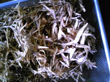 ダイエットせねば ・・・・余命が 7,8年短くなると ドクターから・・ 人間ドックの検査結果を診て 所見を下された ワタクシ目 !! ダイエットは必死なんです~ ! 日本のテレビは ダイエット情報が 多いですから 見まくっています その中でも ゴボウ茶 は・・・気に入りました イタダキです!!ゴボウを皮つきで ササがきにして 天日で干したもの・・ これが 悪玉コレステロールを排泄したり 老廃物の排泄 を助けたり うららにとってうってつけの茶 ( 詳しくは 昨日のブログを・・ ) しかしこのゴボウ茶 いろいろ工夫が 要ります まず初めにした事は・・・ アルミ鍋で・・・一つかみ煮出したんです 色が・・・青みどりに変わって 気色悪いです ← こんな色 多分この色は アルミニュウムと成分が 科学反応を 起こしていると思う ゴボウには・・ 朝鮮ニンジンと同じ 若返りの薬能 サポニン の他 カリウム・・・血圧降下作用、腸内筋肉の活動補助、老廃物の排泄補助 リン・・・エネルギー代謝の補助 アレルギニン・・・成長ホルモンの分泌促進、新陳代謝の促進 アスパラギン酸・・・老廃物の処理、肝機能促進、ミネラルの運搬 なども 有る優れモノの ようですわ ・・・ ゴボウの皮・・・ だから・・普通ゴボウの灰汁の色 と言えば・・ 赤茶色 なのに ・・・ 青みどりの 湯に なるとは・・ イメージが悪くて ゴボウ茶 飲めません!! で・・ 干したゴボウ茶を そのままマグカップに 直接入れて 湯を注ぐようにしています これは・・いいですよ 加減ができます 成分的には どうか知りませんが・・・2.3回湯を足しても飲めます 熱湯を3回も注ぐと・・ ササガキのゴボウ まんま 食べられます ゴボウの臭いが 強すぎるなら 一つまみの量を もっと減らすか・・・ インスタントコーヒーを ほんのほんの少量入れると 臭いは消えます G-さまは・・・高血圧気味だし・・ (140-90)娘takaは・・・ ゴボウ成分のイヌリン・・・水溶性食物繊維 ビフィズス菌の成長促進、悪玉コレステロール排出 リン・・・・・・・・・・・・・・・エネルギー代謝の補助に魅力が有るみたいで・・・ 一家で飲んでいます 飲んだカスのゴボウ・・・野菜スープに入れちゃって 再利用してますヨ