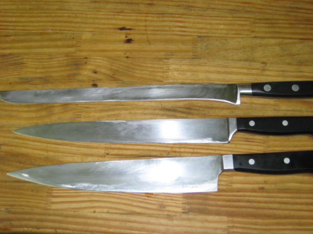 予約で席の残りはあとわずかです。ご来店の際はご連絡ください。ディナーはまだ空席があります。愛用のナイフ達。今日は貸切で写真を撮る余裕が無かったので・・・上からスペインのハム切・ドイツの筋引き・牛刀。ハム用のは骨付きの生ハムをホルダーにセットして切るときには良いが今は骨を外した物を使っているので最近は少しお休みしてます。
