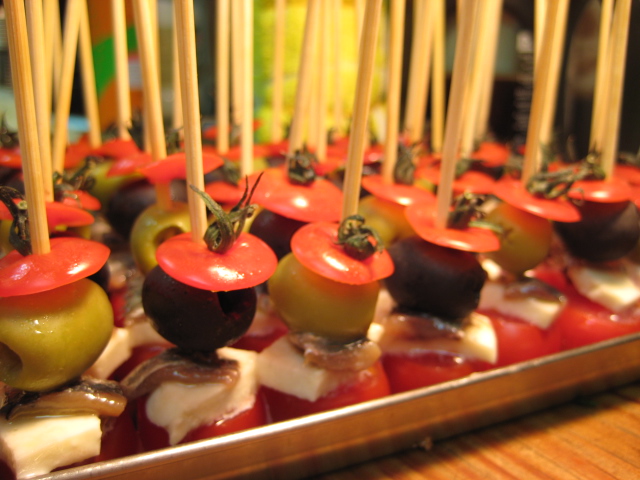 半年近くかけてアンチョビを仕込んでいて出来たのでたまにはスペインチックにプチトマトの上に自家製アンチョビ、モツァレラ、オリーブを乗せて串刺しに。串に刺したおつまみ的なものをピンチョスと言います。薄切りの焼いたバケットの上に具を乗せた物(カナッペみたいな)もこう呼びます。タパス(小皿料理)の1種です。あまりモツァレラチーズは使わないのですが自家製のアンチョビの塩気がきついので和らげるために乗せました。バスク地方に古くからある定番のピンチョスに『ギルダ』と言うのがあってオリーブにアンチョビを巻いてバスク名産の『ギンディージャ』(辛くない青唐辛子の酢漬け)と一緒に串にさすのがあるのですが皆塩分をそれなりに持っているので食べると最初ビックリします。たくさん食べれないけどこの『ギルダ』を食べながら冷やしたシェリーを飲むと最高です。近く『ギンディージャ』を仕入れたらメニューに載せます。