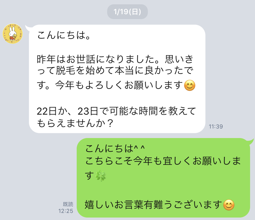 今日は朝からNさん先日、ご予約のお問い合わせに嬉しいお言葉を添えて頂きましたお顔脱毛をして頂いているHさん脱毛を始めるまでは、気になって毎日剃ってたとか。。今回、前回から日が空いたのですが、じ〜〜〜〜〜っと見ないと分からないほど。全く自己処理していないそうです嬉しいなぁ〜また気になるタイミングでご連絡下さいねそして、またまたす〜〜〜っかりご無沙汰になったTちゃんも〜〜〜っ!!ちゃんと定期的に来ます〜って。。来ないじゃん!!!なかなかね〜その気持ちも分かりますまっ。それでも思い出して来てくれるから良しとしますハンドケア甘皮が付きやすいTちゃんだから・・また定期的に・・この下り、いつも今年こそ!!!来れるタイミングで良いから。もう少しお顔見たいな〜また次回、いつでもいつまでも待ってます今日は、私の癒しスポットくずはの『ラボーテ』へ年末バタバタ落ち着かず・・延期延期で今日まで。新年のご挨拶も兼ねてのリラックスタイムAさんいつも有難う今年も、月に一度の私の貴重な癒しタイムを宜しくね明日から、お天気が崩れるようなので・・寒い時は動く!!!!!チョコとお散歩私たち、動かなきゃ!!ね☆~☆~☆~☆~☆~☆~☆~☆~☆~☆~☆~☆予約等のお問い合わせはLINE@またはお電話にて♪090-2343-5527QueSera' LINE@ ID @prj5693v☆~☆~☆~☆~☆~☆~☆~☆~☆~☆~☆~☆☆予約状況☆月・火・水・木・金・土・日午前9時30分~不定休△:限られた空き時間ご予約のお時間等ご相談をお受けします。皆様のご都合に出来るだけ合わせることが出来るように対応しますので、×印でも一度お問い合わせ下さい♪午前・午後 ◆2020年 1月◆22日(水)××23日(木)××24日(金)××25日(土)◯×26日(日)休業27日(月)◯休28日(火)◯◯29日(水)◯◯30日(木)休◯31日(金)×◯◆ 2月 ◆1日(土)△△2日(日)◯◯3日(月)◯◯4日(火)◯◯5日(水)◯◯6日(木)◯◯7日(金)×◯8日(土)◯×9日(日)×◯10日(月)◯◯