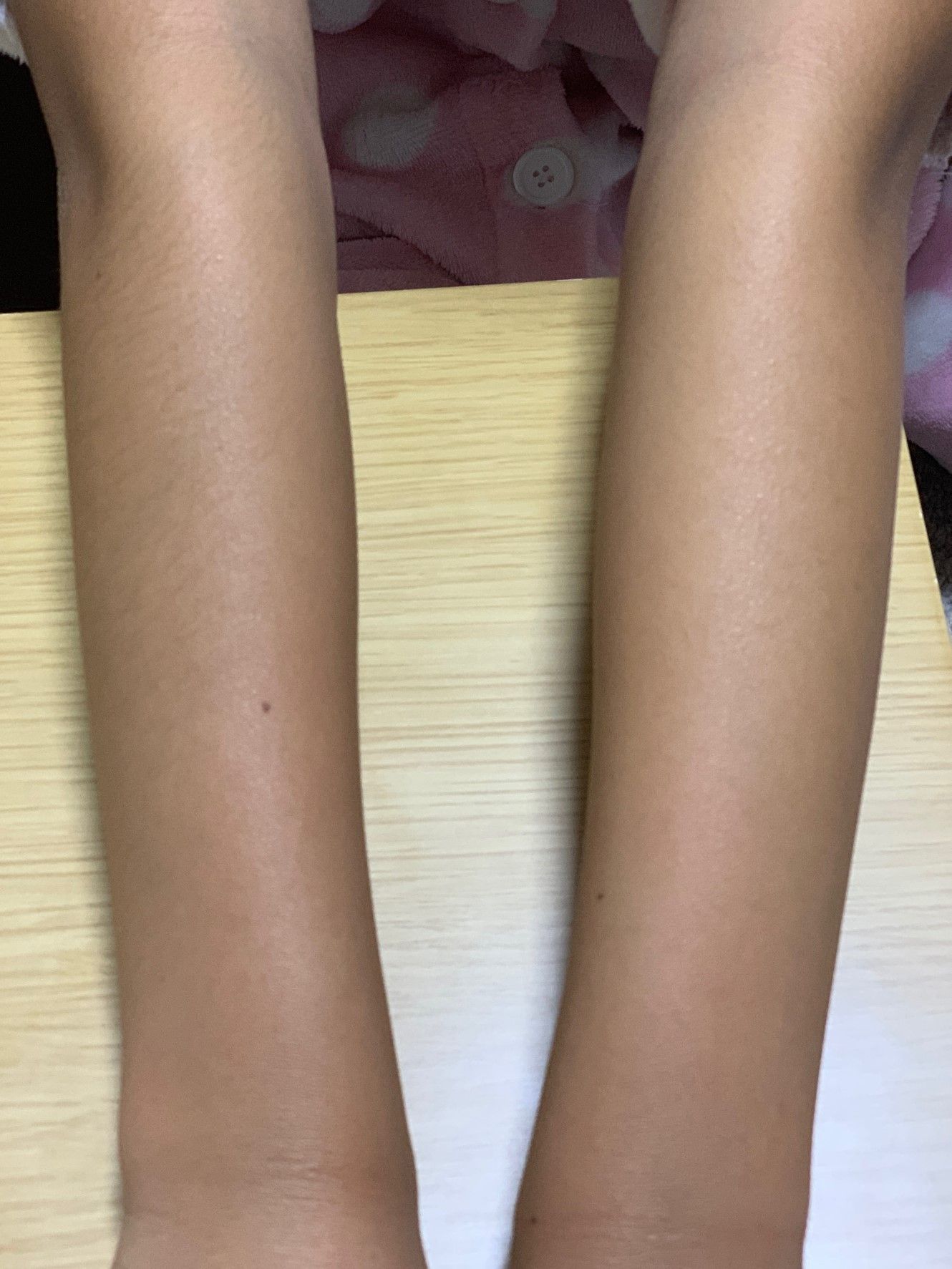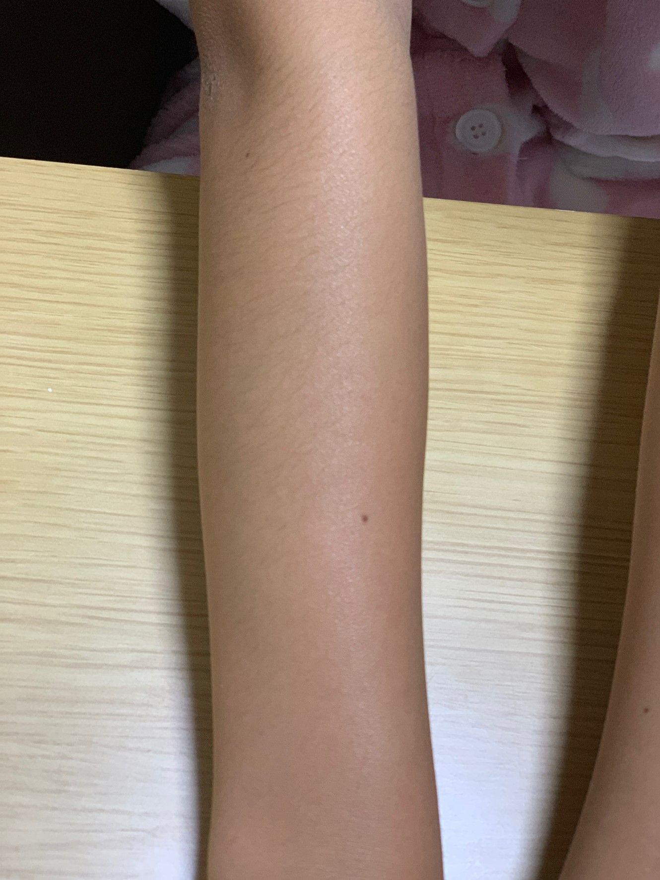 今日で、ちょうど2回の脱毛をして6週間経った娘の腕。
