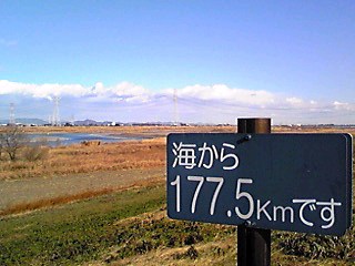 見ての通り、海から177.5kmの地点。川は利根川。関東平野の北西の端に位置し、北東の方向には遠く北関東の山々が見渡せる場所だ。今でも渡し船が見られるということで、島村渡船船着き場に行った。運営は、埼玉県の川向こうの伊勢崎市。渡船は通常対岸にいる。埼玉県側から乗るときは、携帯電話番号に掛けるか、黄色い旗を揚げると船が来てくれるのだ。黄色い旗というのが何とも面白い。料金は無料。しばらく景色を眺めていると、たまたま対岸から渡船が出発した。どんな人が乗ってくるのかと見ると、スポーツサイクルを持った若者が一人。サイクリングの途中に川を渡ってきたようだ。渡船を利用するためにサイクリングしてきたのかもしれない。川を渡るサイクリングロードの光景に、ちょっと感動した。
